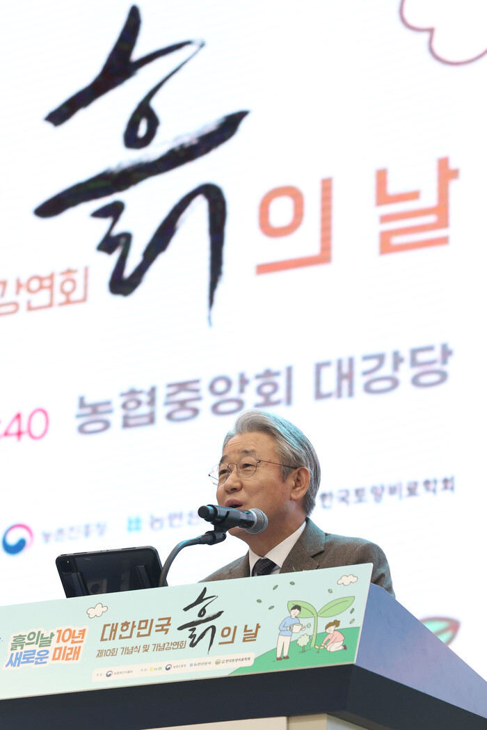 National Agricultural Cooperative Federation Chairman Kang Ho-dong speaks during a ceremony at the federation's headquarters in Seoul on March 11, 2025, Soil Day, which the state-run Rural Development Administration has marked since 2015 as a means to focus attention on the importance of healthy soil and to advocate for the sustainable management of soil resources. (Yonhap)