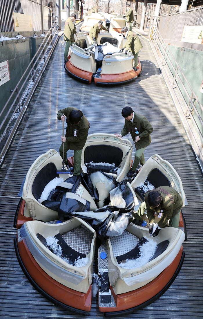 Workers remove snow on the Amazon Express attraction at the Everland amusement park in Yongin, south of Seoul, on Feb. 13, 2025, to clean it ahead of its reopening on Feb. 15. (Yonhap)