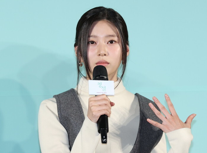 South Korean actress Kim Min-joo, who stars in the new movie "Hear Me: Our Summer," greets during a publicity event in Seoul on Oct. 18, 2024. The movie will be released in South Korea on Nov. 6. (Yonhap)
