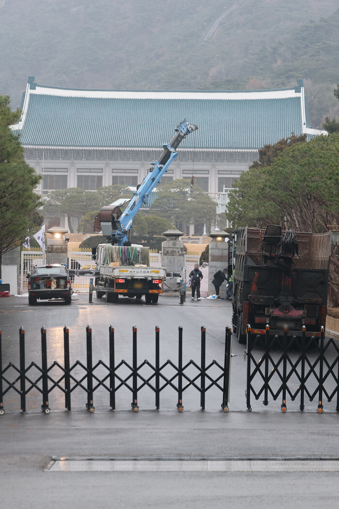 Workers use a crane outside the former presidential office of Cheong Wa Dae in central Seoul on Dec. 20, 2025. The current Lee Jae Myung administration plans to relocate the presidential office back to Cheong Wa Dae by the year's end. (Yonhap)
