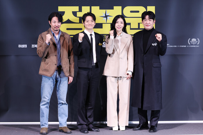 The stars of the new movie "The Informant" -- Jo Bok-rae, Seo Min-joo and Heo Sung-tae (2nd L to R) -- along with director Kim Seok (L) -- pose for a photo during a publicity event in Seoul on Nov. 20, 2025, to promote the movie, set to hit local screens in South Korea on Dec. 3. (Yonhap)