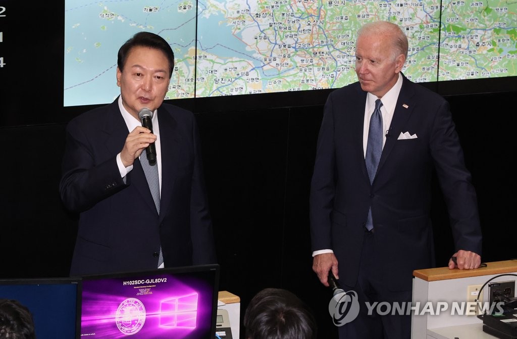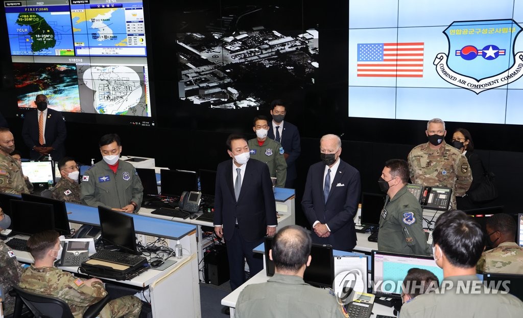SEOUL, May 22 (Yonhap) -- President Yoon Suk-yeol and U.S. President Joe Biden visited an Air Force operations center Sunday on the last stop of Biden's three-day trip to South Korea, underscoring the allies' readiness against threats from North Korea.