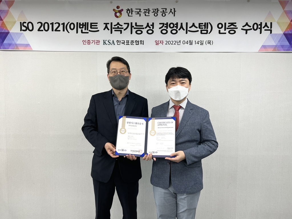 (서울=연합뉴스) 박상돈 기자 = 한국관광공사는 국제표준화기구(ISO)가 제정한 이벤트 관련 국제 표준인 ISO 20121 인증을 한국표준협회로부터 획득했다고 14일 밝혔다.