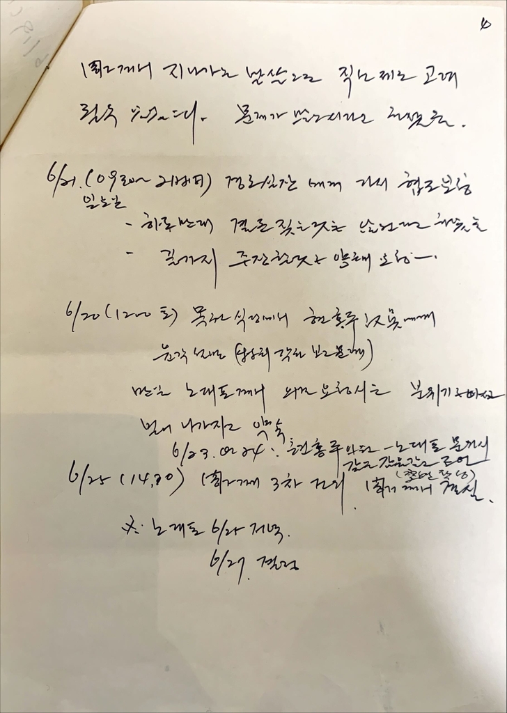 (서울=연합뉴스) 김예나 기자 = '6월 21일 경호실장에게 가서 협조 요청.…25일 각하께 3차 건의, 각하께서 결심. 노 대표 25일 저녁, 27일 결정.'