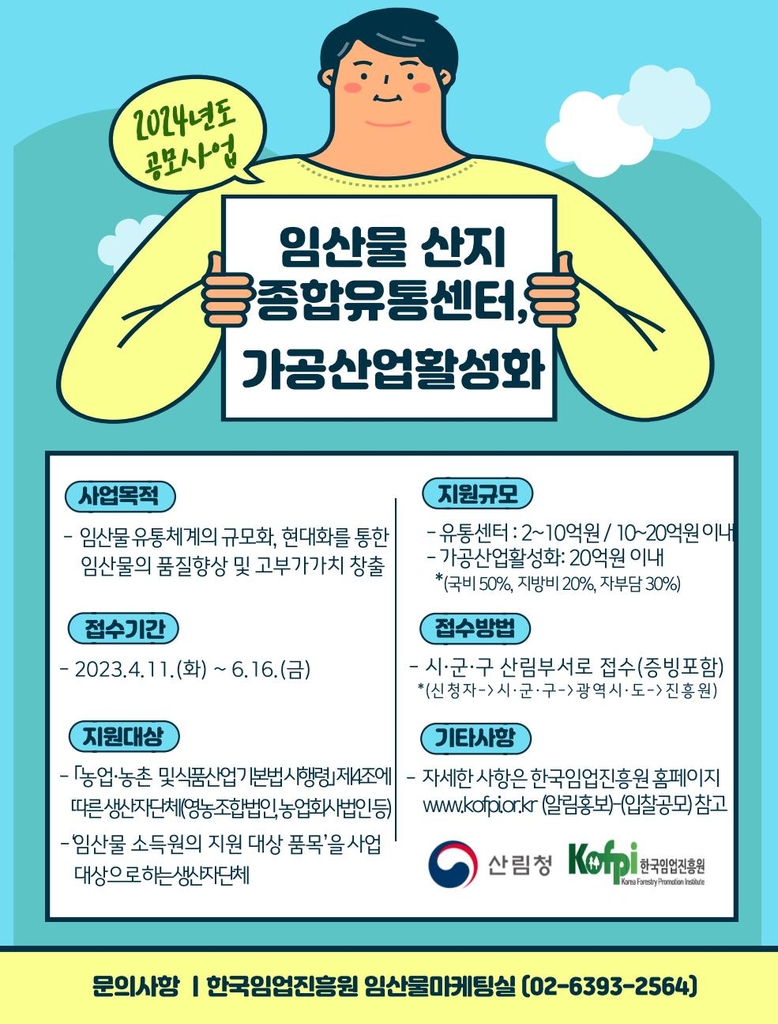 한국임업진흥원에서 전국단위로 모집하는 이번 공모사업은 영농조합법인·농업회사법인 등 생산자단체를 대상으로 하는 산지종합유통센터사업(4개소, 40억원, 보조율 70%), 임산물 가공산업활성화사업(1개소, 20억원, 보조율 70%)이 있다.
