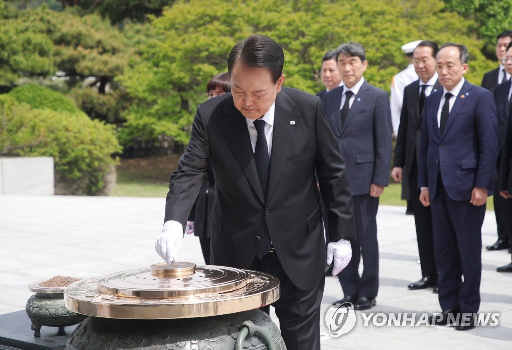 Yoon laid flowers and burned incense in front of a memorial at the cemetery, where the nation's war veterans, independence fighters, past presidents and others are laid to rest.