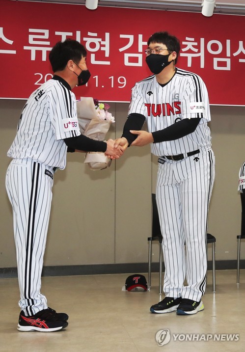| ▲ 수석코치와 악수하는 류지현 LG 감독 (서울=연합뉴스) 이정훈 기자 = 류지현 LG 트윈스 신임 감독이 19일 오후 서울 잠실야구장에서 열린 취임식에서 김동수 수석코치로부터 꽃다발을 받고 있다. 2020.11.19 uwg806@yna.co.kr |