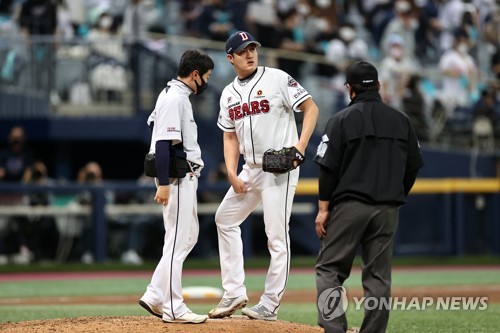 두산 김강률, 오른쪽 허벅지 근육 경련으로 강판