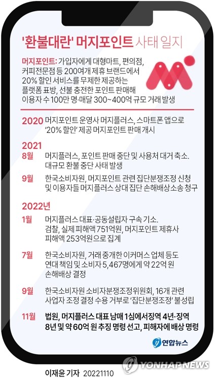 | ▲ [그래픽] '환불대란' 머지포인트 사태 일지 (서울=연합뉴스) 이재윤 기자 = 환불 중단 사태로 수천억원대 피해를 낸 '머지포인트' 운영사 대표 남매가 1심에서 실형을 선고받았다. 서울남부지법 형사11부(성보기 부장판사)는 10일 사기 등 혐의로 기소된 권남희(38) 머지플러스 대표와 권보군(35) 최고전략책임자(CSO)에게 각각 징역 4년과 8년을 선고했다. yoon2@yna.co.kr 트위터 @yonhap_graphics 페이스북 tuney.kr/LeYN1 |