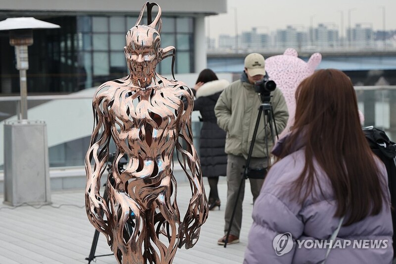 ▲ 미리보는 제15회 서울국제조각페스타 2026 (서울=연합뉴스) 류효림 기자 = 9일 서울 여의도 한강버스 선착장에서 열린 제15회 서울국제조각페스타 2026 프리뷰 및 기자간담회에서 참석자들이 전시 작품을 살펴보고 있다. 2026.1.9 ryousanta@yna.co.kr