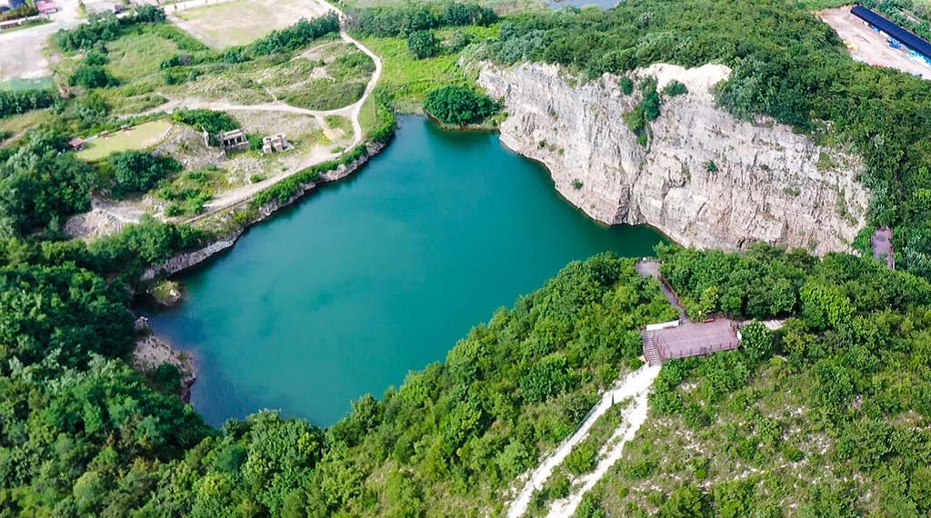 대부광산은 현재 돌을 채취하며 생긴 퇴적암층 절벽이 커다란 인공호수를 병풍처럼 둘러싸고 있다.