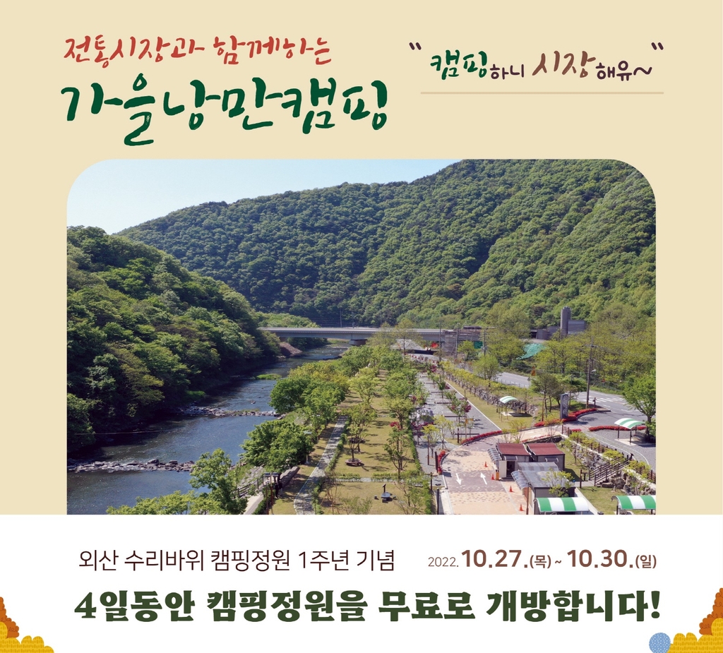 '전통시장과 함께하는 가을낭만캠핑'이란 이번 행사는 개장 1주년을 기념해 캠핑정원을 찾는 관광객들에게 추억과 힐링을 선사하고 97년 역사의 외산전통시장을 선보인다는 취지로 기획됐다.