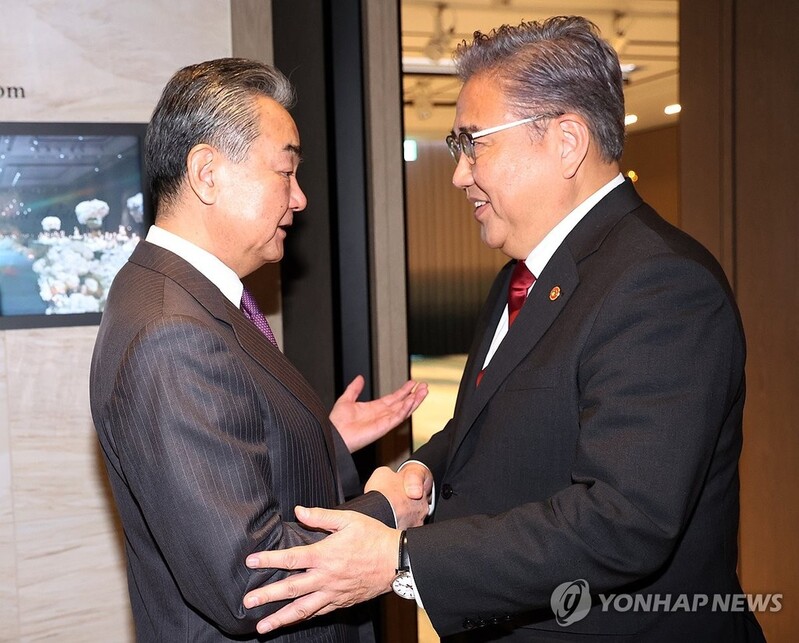 | ▲ South Korean Foreign Minister Park Jin (R) meets with his Chinese counterpart, Wang Yi, ahead of their bilateral talks in the southeastern port city of Busan on Nov. 26, 2023. (Yonhap) |