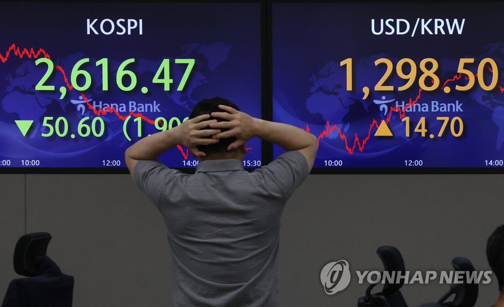 The benchmark Korea Composite Stock Price Index (KOSPI) retreated 1.9 percent, or 50.6 points, to 2,616.47. Trading volume was heavy at 694.5 million shares worth 15.7 trillion won (US$12.1 billion), with decliners outnumbering gainers 652 to 230.