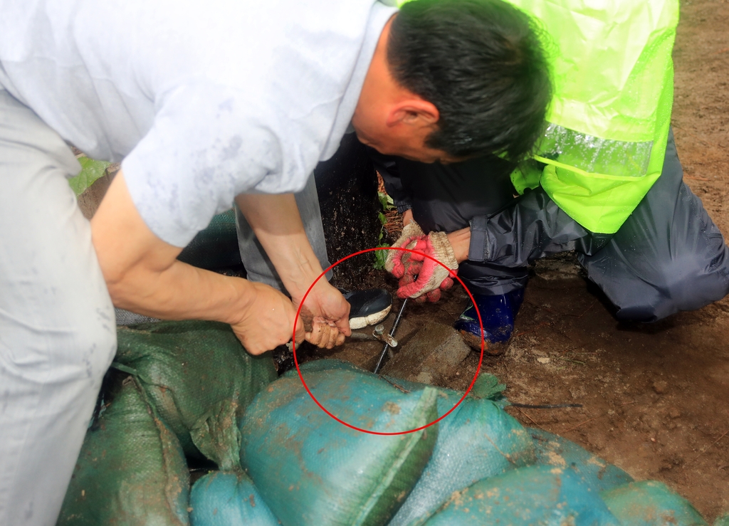 | ▲ '알박기' 텐트 철거된 자리에 (제주=연합뉴스) 백나용 기자 = 30일 오후 제주시 관계자 등이 제주시 협재해수욕장과 금능해수욕장 사이 녹지 지역에 있는 '알박기' 텐트를 강제 철거하고 텐트가 있던 땅에 행정대집행 계고장을 못으로 박고 있다. 협재·금능 해수욕장 야영장은 시민과 관광객이 효율적으로 사용할 수 있도록 7월 1일부터 8월 31일까지 지역 청년회에 위탁해 한시적으로 유료 운영된다. 2023.6.30 dragon.me@yna.co.kr |