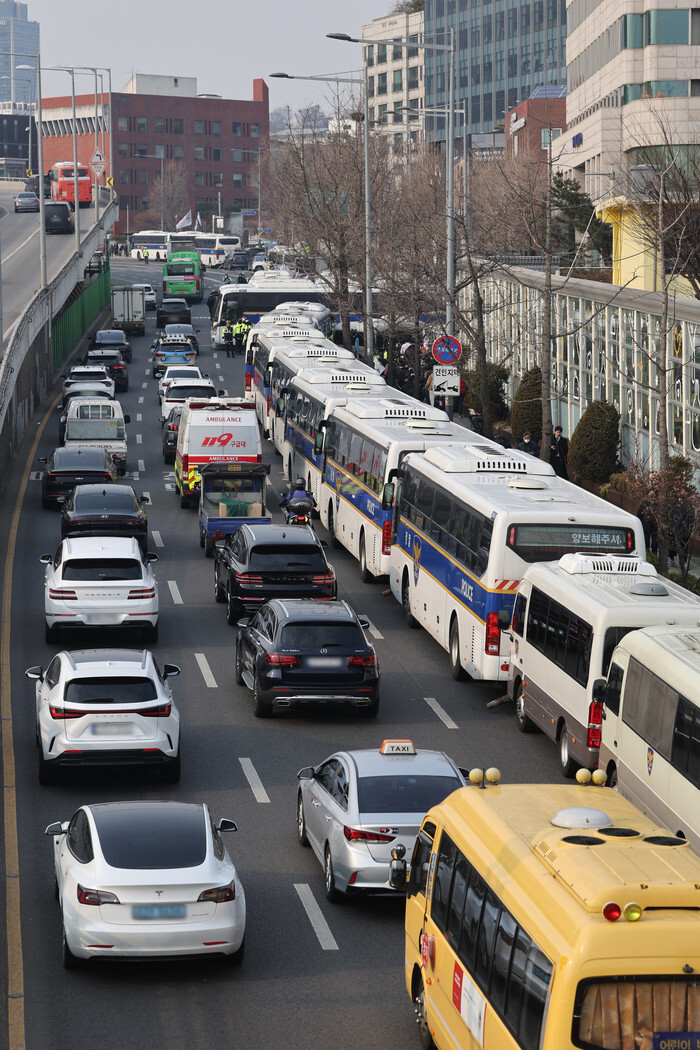 A barricade of police buses is set up near impeached President Yoon Suk Yeol's official residence in Seoul on March 7, 2025, after a court ordered Yoon to be released from custody following its acceptance of his request to cancel his arrest over his short-lived imposition of martial law. (Yonhap)