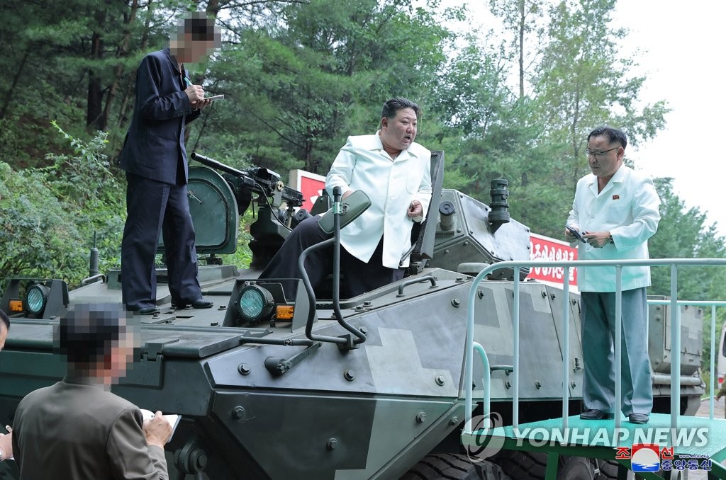 Photos released by state media show Kim driving what the North called a "newly-developed utility combat armored vehicle" during his visit to one of the factories.