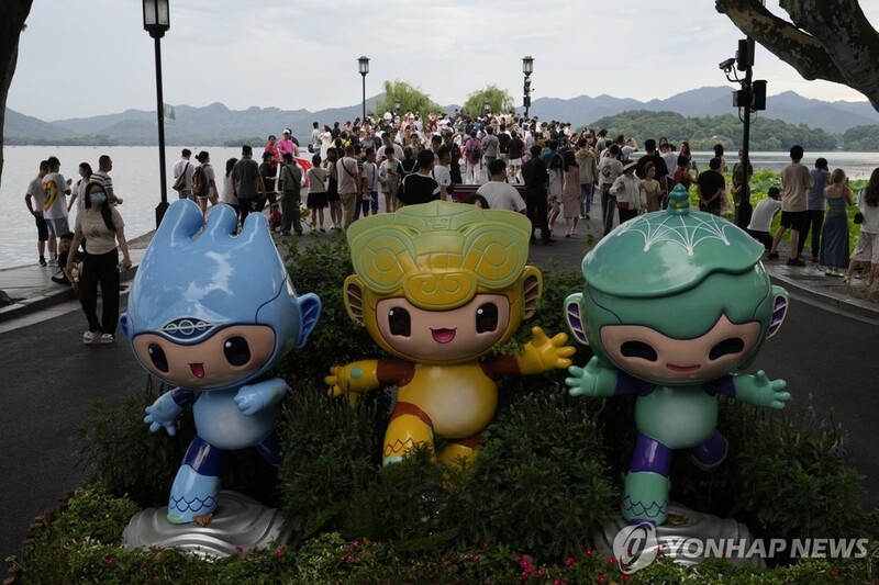 ▲ This Associated Press file photo from June 26, 2023, shows the mascots of the Hangzhou Asian Games on display in Hangzhou, China. (Yonhap)
