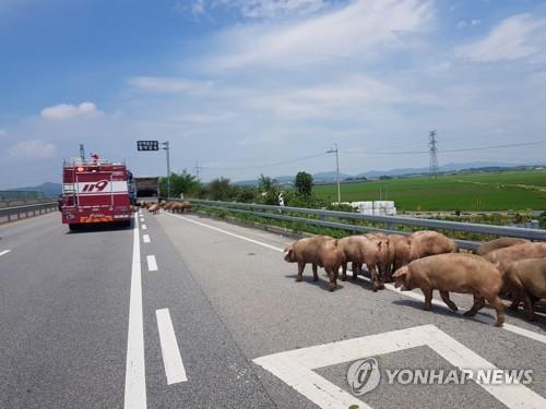 GUNSAN, South Korea, July 28 (Yonhap) -- A truck carrying about 70 pigs caught fire on a local road in the southwestern city of Gunsan on Friday, prompting herds of the livestock to roam and causing a traffic shutdown for a while.