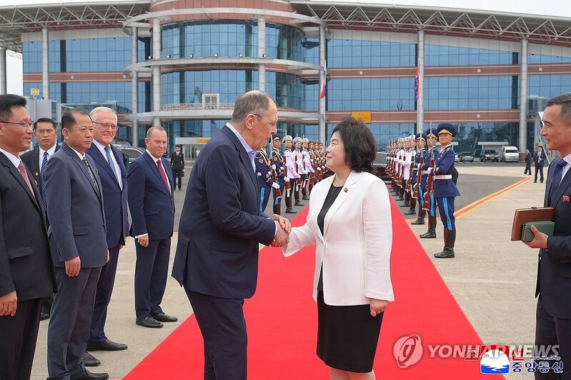 | ▲ This photo, carried by North Korea's official Korean Central News Agency on July 14, 2025, shows Russian Foreign Minister Sergei Lavrov (L) shaking hands with North Korean Foreign Minister Choe Son-hui before leaving North Korea the previous day following a three-day visit to the eastern coastal city of Wonsan. (For Use Only in the Republic of Korea. No Redistribution) (Yonhap) |