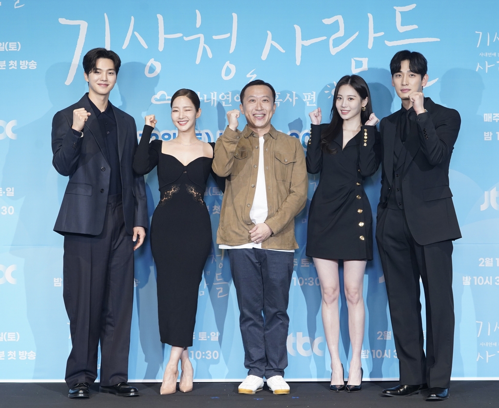 | ▲ TBC 새 토일드라마 '기상청 사람들: 사내연애 잔혹사 편' 출연진과 PD (왼쪽부터) 송강, 박민영, 차영훈 PD, 유라, 윤박. [JTBC 제공. 재판매 및 DB 금지] |