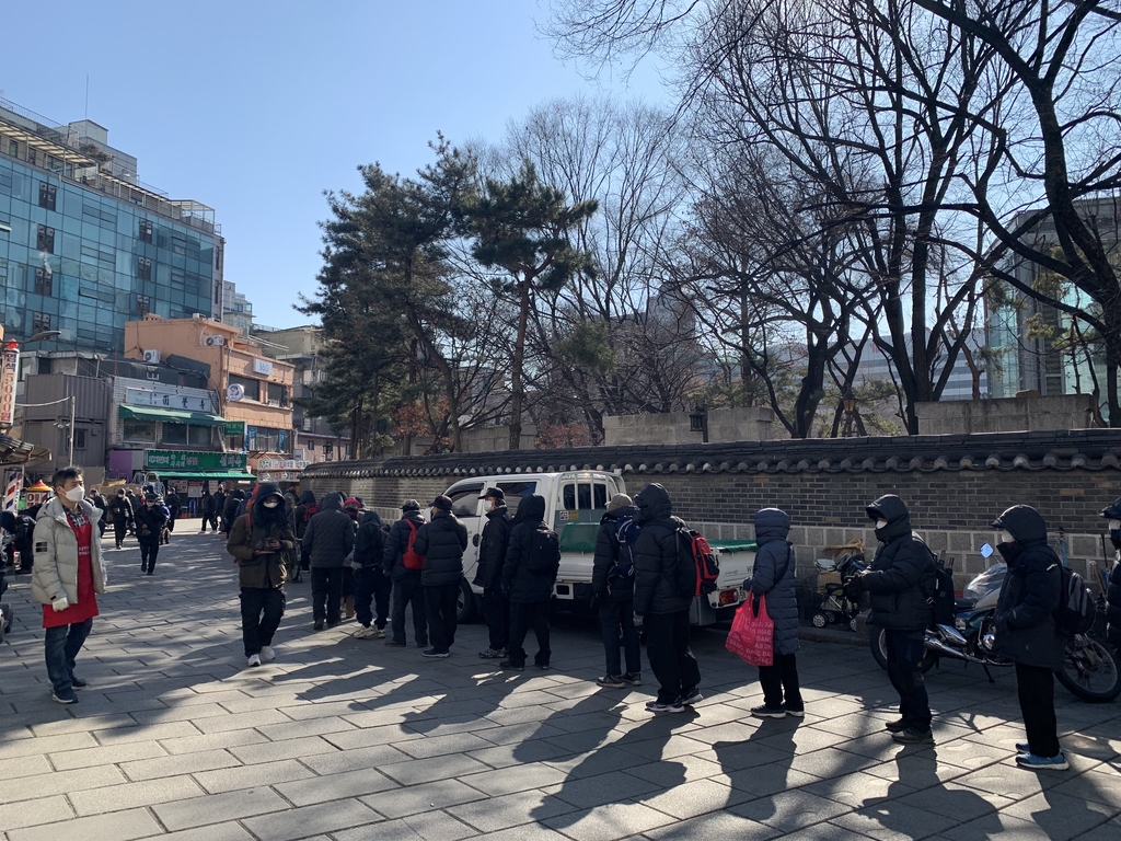 | ▲ 탑골공원 무료급식소 앞 길게 늘어선 줄 [촬영 김다을] |