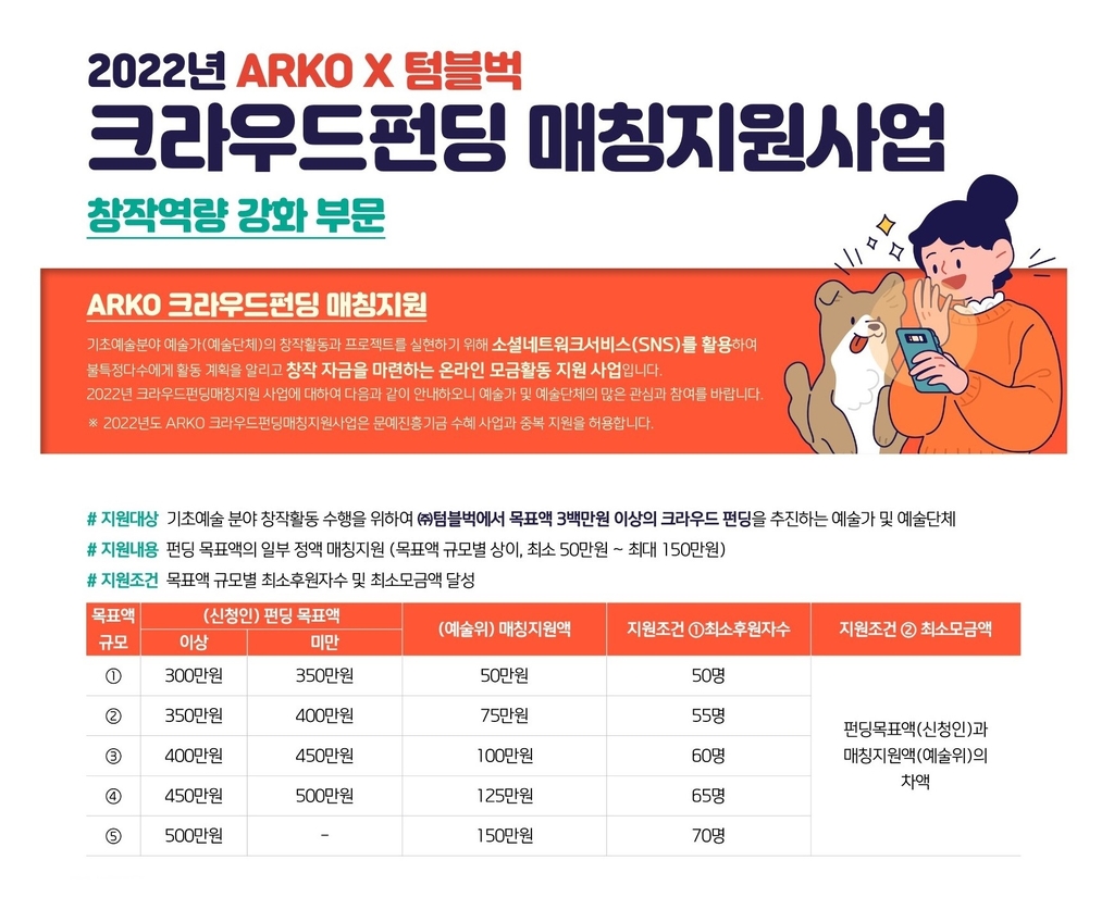이번 사업은 창작 활동을 위해 크라우드 펀딩 플랫폼 텀블벅에서 목표액 300만 원 이상의 펀딩을 추진하는 예술가 및 예술단체에 목표액 일부를 지원한다.
