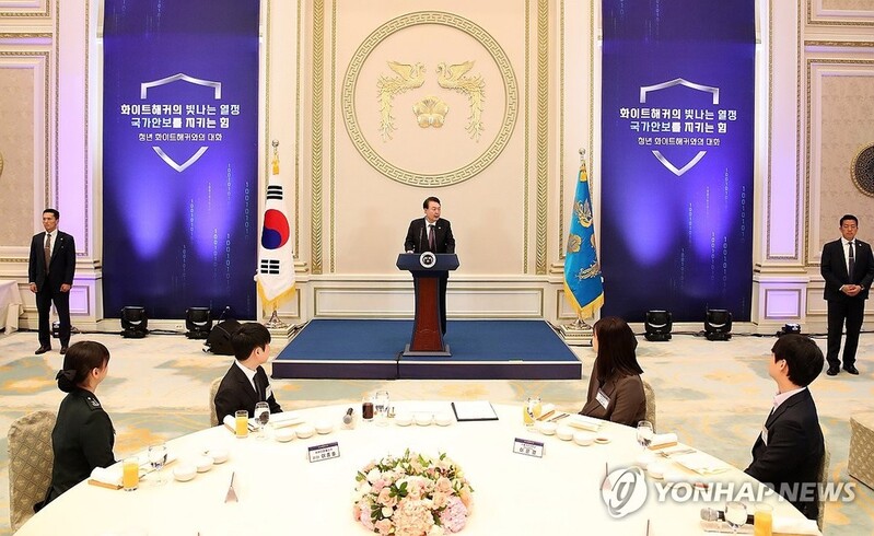Yoon made the promise while meeting with a group of young white hat hackers -- individuals who identify security vulnerabilities in computer systems and help prevent malicious hacking -- and praised them for their recent achievements at the DEF CON hacker convention and other competitions at home and abroad.