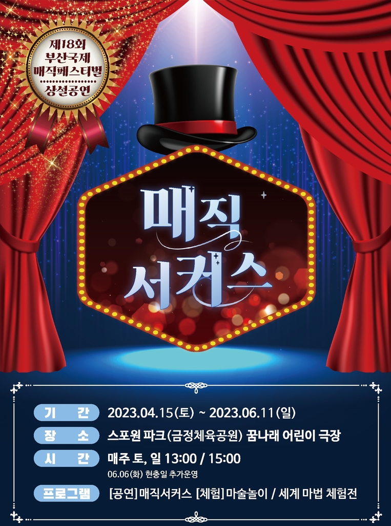 (부산=연합뉴스) 조정호 기자 = 부산국제매직페스티벌 조직위원회는 오는 15일부터 6월 11일까지 주말마다 스포원파크 꿈나래어린이극장에서 '매직서커스(봄)'을 마련한다고 밝혔다.