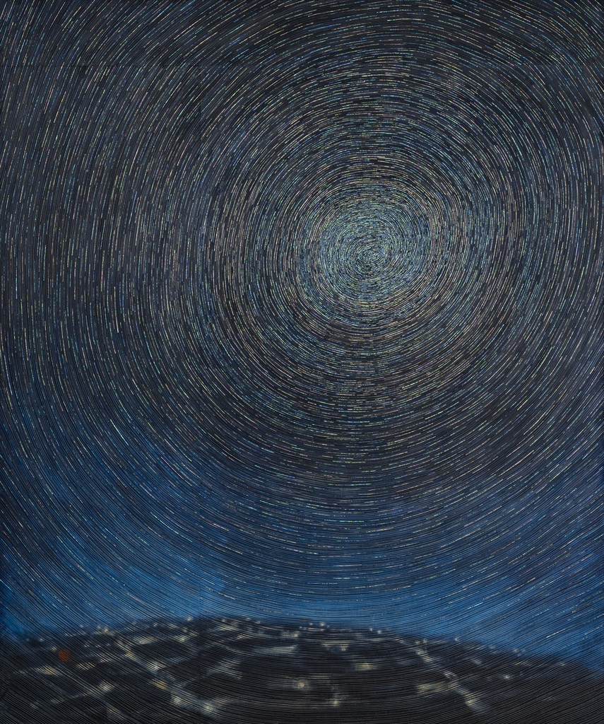 김덕용 작가가 표현한 '결-심현'은 나뭇결을 따라 자개 조각을 이어 붙여 별을 표현했다. 어두운 푸른빛 배경이 더해지면서 마치 별들이 따라 움직이는 듯한 느낌이 든다.