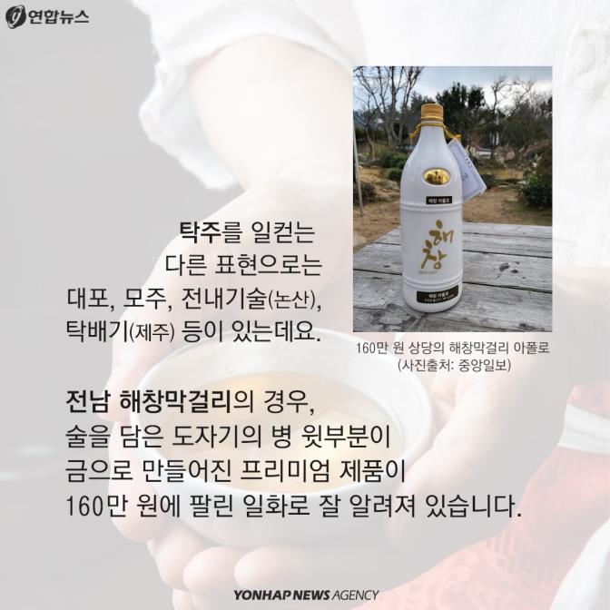 전남 해창막걸리의 경우, 술을 담은 도자기의 병 윗부분을 금으로 만든 프리미엄 제품이 160만 원에 팔리기도 했습니다.