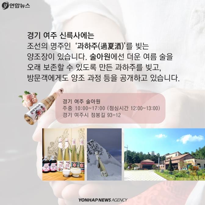경기도 여주의 신륵사에는 조선 명주인 '과하주(過夏酒)'를 빚는 양조장 '술아원'이 있습니다. 이곳에선 더운 여름 술을 오래 보존할 수 있도록 만든 과하주를 빚고, 방문객에게도 양조 과정 등을 공개하고 있습니다.