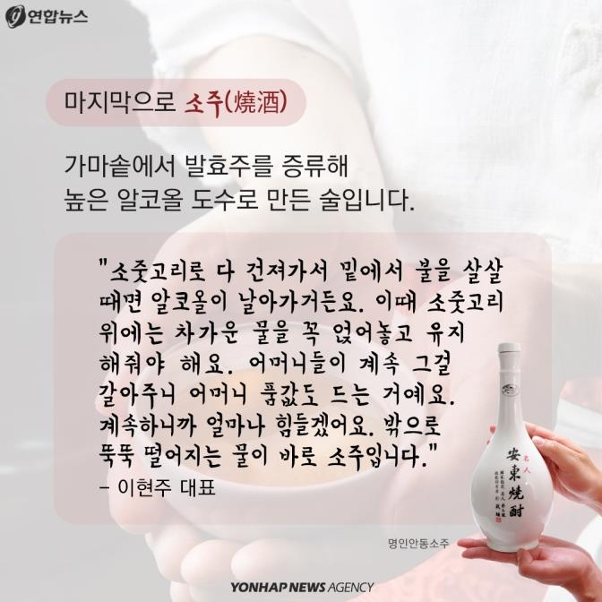 "소줏고리로 다 건져가서 밑에서 불을 살살 때면 알코올이 날아가거든요. 이때 소줏고리 위에는 차가운 물을 꼭 얹어놓고 유지해줘야 해요. 어머니들이 계속 그걸 갈아주니 어머니 품값도 드는 거예요. 계속하니까 얼마나 힘들겠어요. 밖으로 뚝뚝 떨어지는 물이 바로 소주입니다." - 이현주 대표