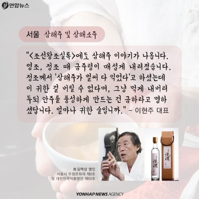 "삼해소주의 경우 보통 삼해주 약주가 5병이 있어야만 소주 한 병을 만들 수 있어요. '조선왕조실록'에도 삼해주 이야기가 나옵니다. 영조, 정조 때 금주령이 매섭게 내려졌습니다. 정조께서 '삼해주가 벌써 다 익었다'고 하셨는데 이 귀한 걸 버릴 수 없다며, 그냥 먹게 내버려 두되 안주를 풍성하게 만드는 건 금하라고 명하셨답니다. 얼마나 귀한 술입니까." - 이현주 대표
