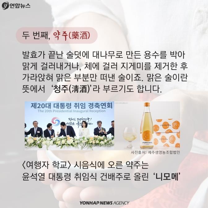 '여행자 학교' 강연의 시음식에서 선보인 약주는 윤석열 대통령 취임식 건배주로 올려서 더욱 유명해진 '니모메(제주 방언 '너의 마음에' 라는 뜻)'라는 술이었습니다.