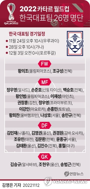 | ▲ [그래픽] 2022 카타르 월드컵 한국대표팀 26명 명단 (서울=연합뉴스) 김영은 기자 = 0eun@yna.co.kr 트위터 @yonhap_graphics 페이스북 tuney.kr/LeYN1 |