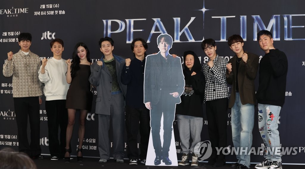 | ▲ 아이돌 오디션 예능 '피크타임' (서울=연합뉴스) 강민지 기자 = 15일 오후 서울 마포구 스탠포드호텔에서 열린 예능 '피크타임(PEAK TIME)' 제작발표회에서 심사위원단이 포즈를 취하고 있다. 왼쪽부터 이승기, 심재원, 티파니영, 박재범, 마건영PD, 박지예 PD, 이기광, 김성규, 라이언전. 2023.2.15 mjkang@yna.co.kr |