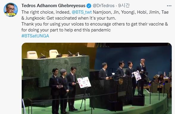 (제네바=연합뉴스) 임은진 특파원 = 세계보건기구(WHO) 사무총장이 유엔 총회에서 코로나19 백신 접종의 중요성을 언급한 방탄소년단(BTS)에 감사 인사를 전했다.