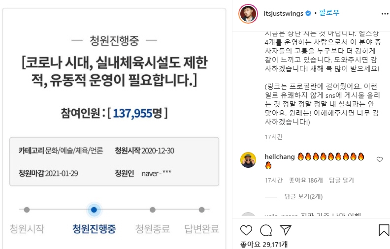 스윙스는 4일 '코로나 시대, 실내체육시설도 제한적·유동적 운영이 필요합니다'라는 제목의 청와대 국민청원 게시물을 캡처한 사진과 함께 이에 동참해달라는 취지의 글을 소셜미디어에 올렸다.