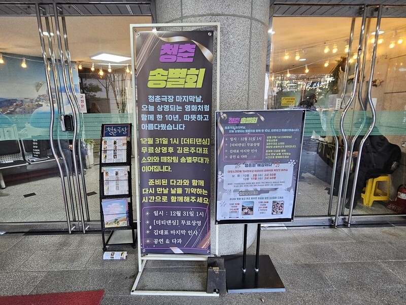 2025년의 마지막 날 오후. 서대문구의 실버영화관 '청춘극장'의 고별 공연을 앞두고 열린 '청춘 송별회'는 뜻밖의 성토장이 됐다. "왜 다음 공연은 없는 거냐", "탄원서라도 써야 하냐"며 객석 여기저기서 볼멘소리가 터져 나온 것이다.