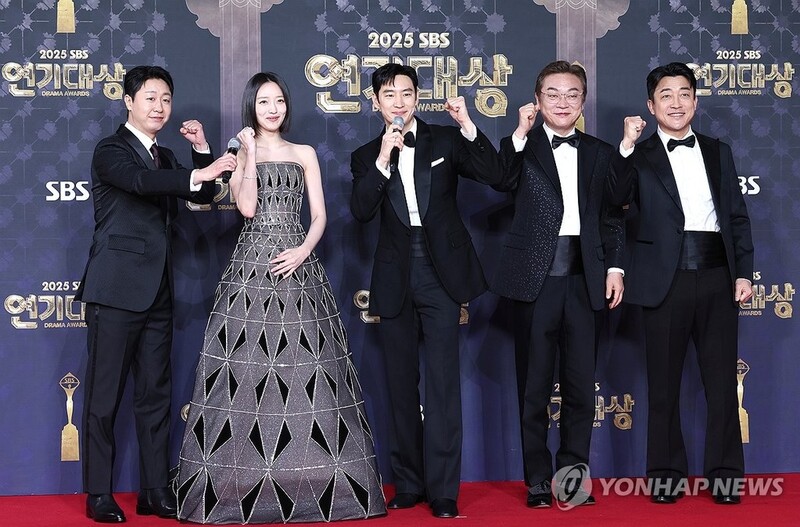 | ▲ 드라마 '모범택시3' 파이팅 (서울=연합뉴스) 진연수 기자 = 31일 오후 서울 마포구 SBS프리즘타워에서 열린 '2025 SBS 연기대상 시상식' 레드카펫 행사에서 배우 배유람(왼쪽부터), 표예진, 이제훈, 김의성, 장혁진이 포즈를 취하고 있다. 2025.12.31 jin90@yna.co.kr |