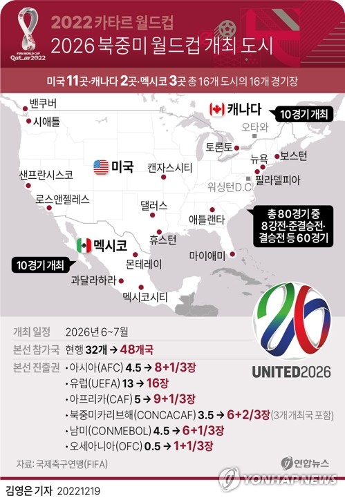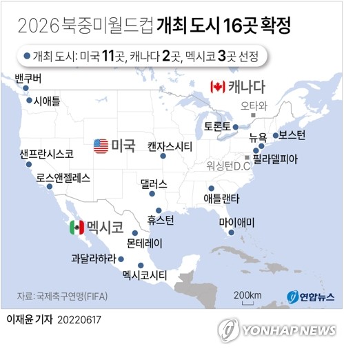 | ▲ [그래픽] 2026 북중미월드컵 개최 도시 16곳 확정 (서울=연합뉴스) 이재윤 기자 = 미국·캐나다·멕시코가 공동 개최하는 2026년 국제축구연맹(FIFA) 월드컵이 열리는 도시 16곳이 최종 확정됐다.