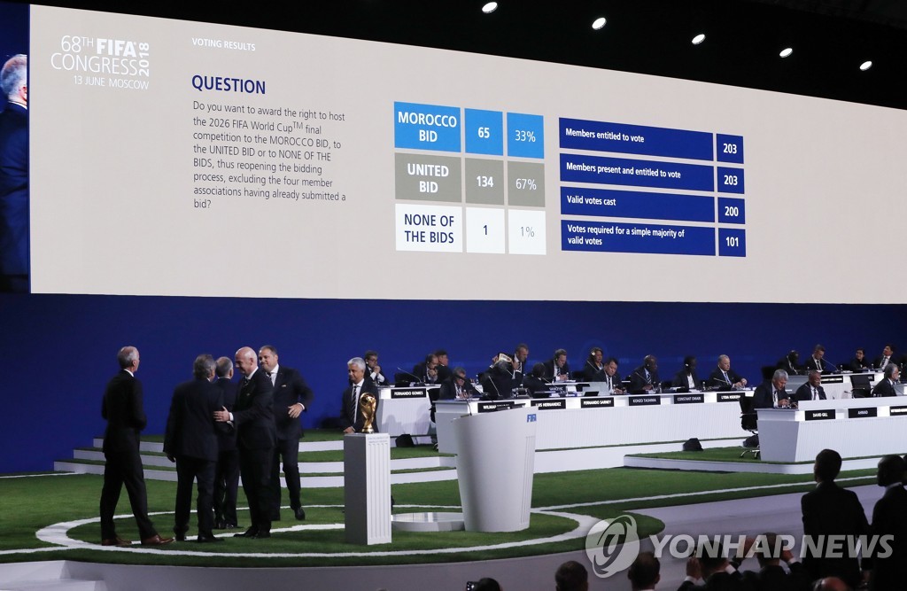 | ▲ 2018년 FIFA 총회에서 2026 월드컵 개최지로 결정되자 기뻐하는 북중미 3개국 연합 대표단 [EPA=연합뉴스 자료사진] |