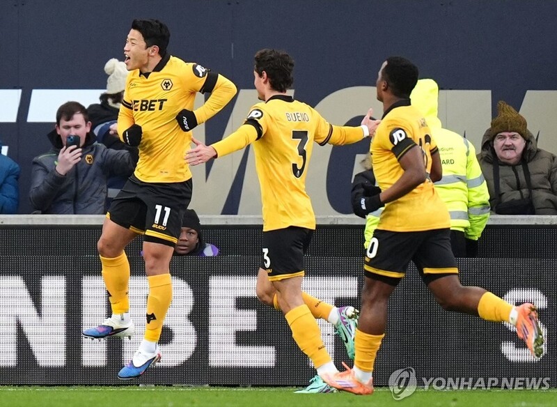 | ▲ 웨스트햄을 상대로 페널티킥 득점에 성공하고 기뻐하는 울버햄프턴의 황희찬(맨 왼쪽) [AP=연합뉴스] |