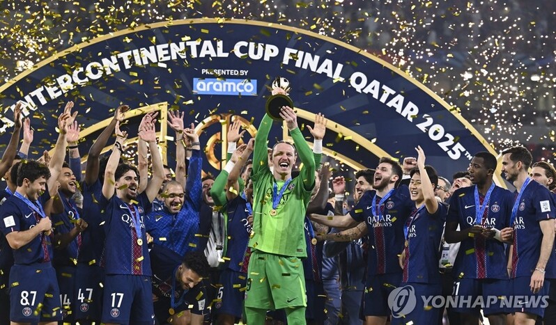 | ▲ 2025 국제축구연맹(FIFA) 인터콘티넨털컵 우승 트로피를 들고 기뻐하는 PSG 선수들 [EPA=연합뉴스 자료사진] |