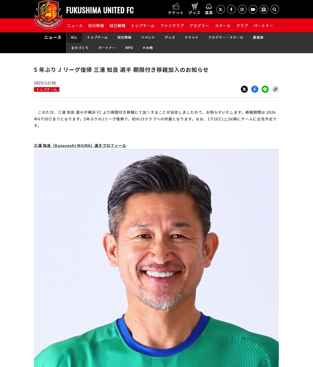 | ▲ 후쿠시마 유나이티드에 2026년 6월 30일까지 임대 이적한 미우라 가즈요시 [후쿠시마 유나이티드 홈페이지 캡처. 재판매 및 DB 금지] |