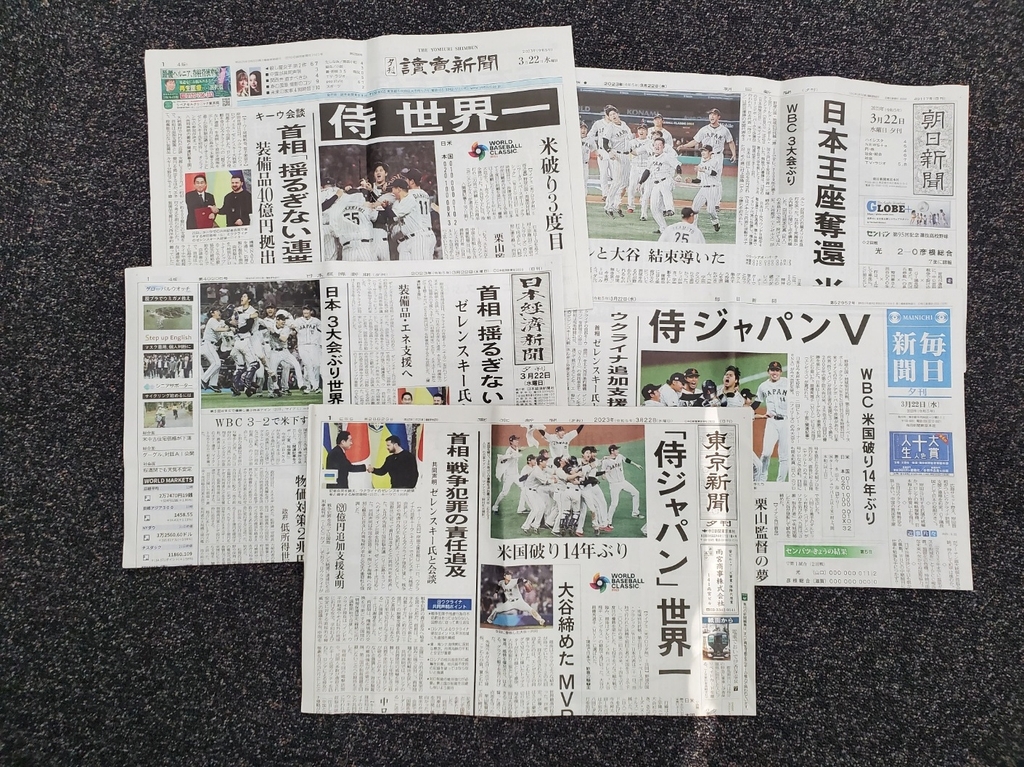 요미우리, 아사히, 마이니치, 니혼게이자이, 도쿄 등 5개 일본 석간신문은 모두 일본 야구 대표팀 '사무라이 재팬'의 WBC 우승을 '일본 왕좌 탈환' 등의 제목으로 1면에 게재했다.