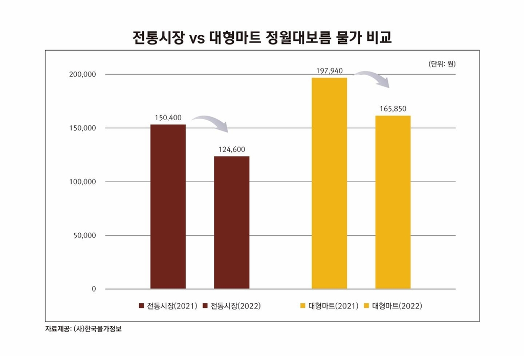 대형마트에서 구매할 때는 16만5천850원이 필요하지만, 전통시장 구매 가격은 대형마트보다 33.1% 저렴하다.