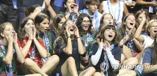 | ▲ 응원하는 스카우트 대원들 (전주=연합뉴스) 10일 전북 전주실내체육관에서 진행된 문화관광프로그램에 참여한 새만금 세계스카우트잼버리 대원들이 비보잉 댄서를 응원하고 있다. 2023.8.10 [전북도 제공. 재판매 및 DB 금지] |