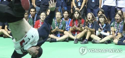 (전주=연합뉴스) 10일 전북 전주실내체육관에서 진행된 문화관광프로그램에 참여한 새만금 세계스카우트잼버리 대원들이 비보잉 공연을 관람하며 눈을 떼지 못하고 있다.